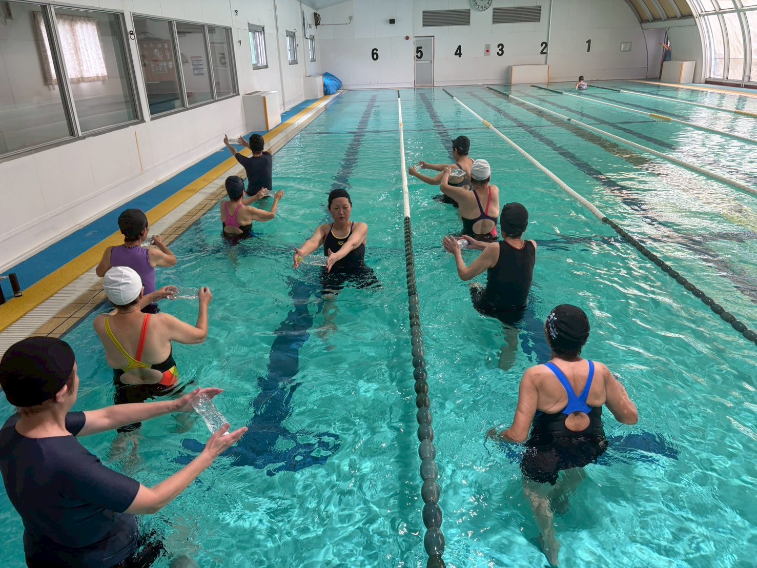 プールの中でできる比較的簡単な運動を、みんなで行うクラスです。